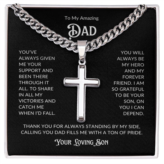 To My Amazing Dad | My Hero | Cuban Chain with Artisan Cross Necklace - Gift for Father's Day, Birthdays, Holidays, Just Because