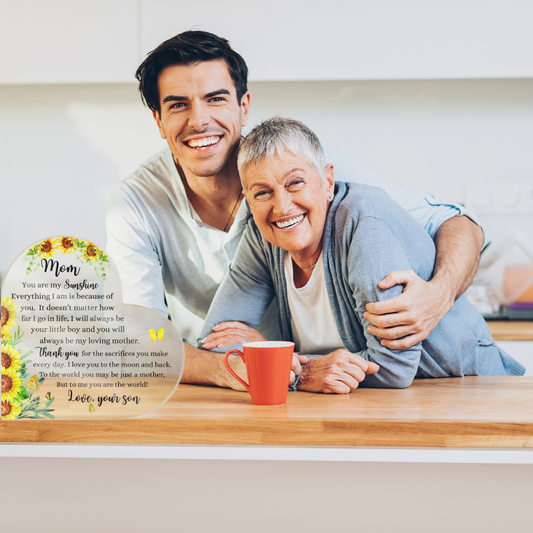 Mom | Your are My Sunshine - Son | Sunflowers Printed Heart Shaped Acrylic Plaque | Gift for Mother's Day, Birthdays, Holidays, Special Occasions